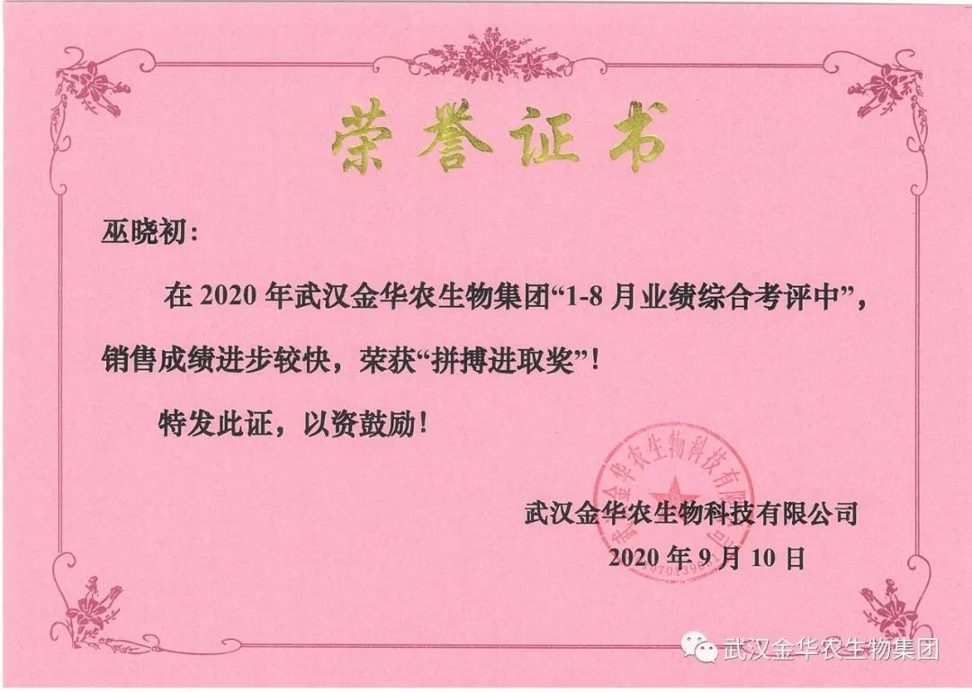 祝賀福建巫曉初經(jīng)理,他在2020年武漢金華農(nóng)生物集團(tuán)“1-8月業(yè)績綜合考評(píng)中”銷售成績進(jìn)步較快,他拼搏進(jìn)取,踴躍報(bào)貨,榮獲武漢金華農(nóng)老人團(tuán)隊(duì)“拼搏進(jìn)取獎(jiǎng)”,他是一位優(yōu)秀的“老武漢金華農(nóng)人”,為他鼓掌!為他點(diǎn)贊!