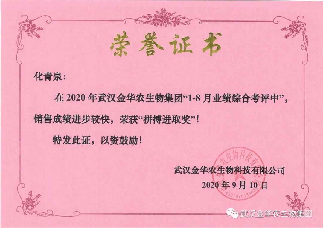 祝賀山東化青泉經(jīng)理,他在2020年武漢金華農(nóng)生物集團(tuán)“1-8月業(yè)績綜合考評(píng)中”銷售成績進(jìn)步較快,他拼搏進(jìn)取,踴躍報(bào)貨,榮獲武漢金華農(nóng)老人團(tuán)隊(duì)“拼搏進(jìn)取獎(jiǎng)”,他是一位優(yōu)秀的“老武漢金華農(nóng)人”,為他鼓掌!為他點(diǎn)贊!