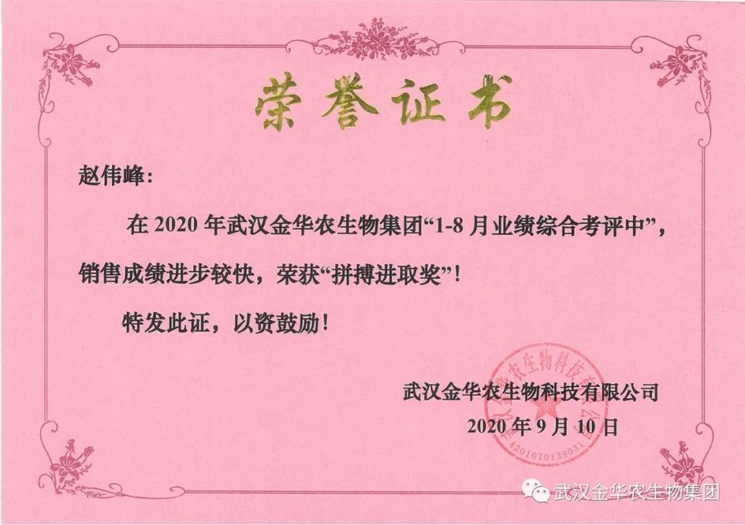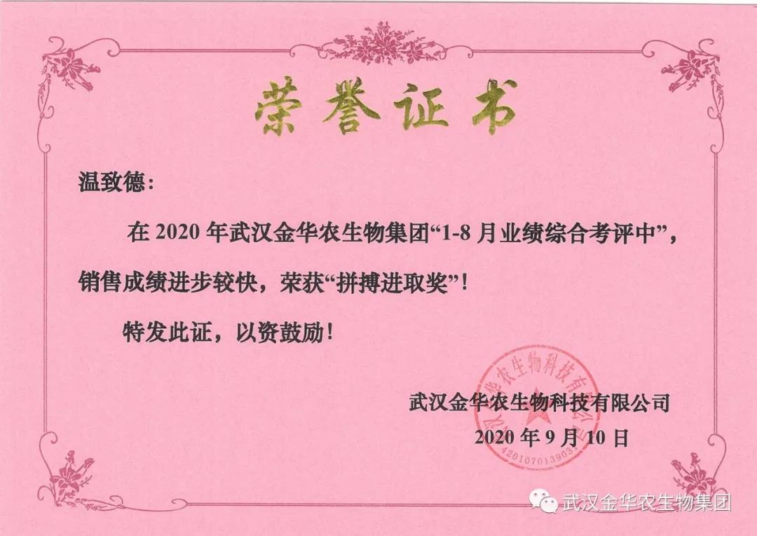 祝賀廣東張興遠(yuǎn)經(jīng)理,他在2020年武漢金華農(nóng)生物集團(tuán)“1-8月業(yè)績綜合考評(píng)中”銷售成績進(jìn)步較快,他拼搏進(jìn)取,踴躍報(bào)貨,榮獲武漢金華農(nóng)老人團(tuán)隊(duì)“拼搏進(jìn)取獎(jiǎng)”,他是一位優(yōu)秀的“老武漢金華農(nóng)人”,為他鼓掌!為他點(diǎn)贊!