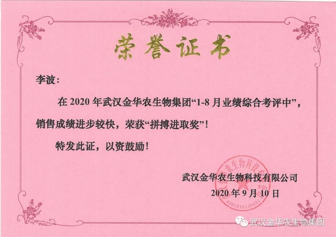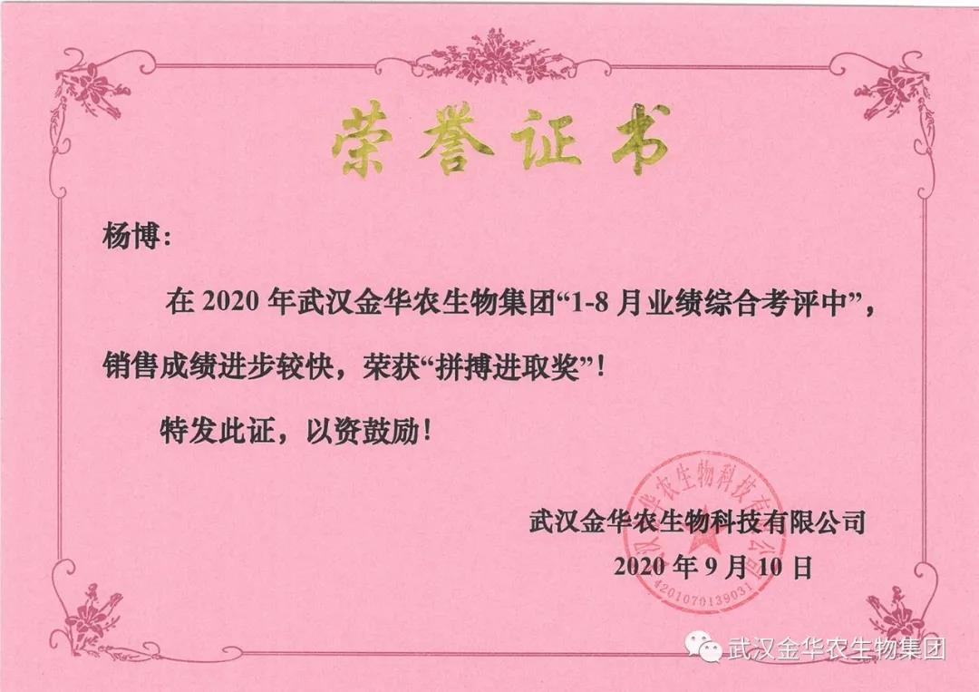祝賀黑龍江楊博經(jīng)理,他在2020年武漢金華農(nóng)生物集團(tuán)“1-8月業(yè)績綜合考評(píng)中”銷售成績進(jìn)步較快,他拼搏進(jìn)取,踴躍報(bào)貨,榮獲武漢金華農(nóng)老人團(tuán)隊(duì)“拼搏進(jìn)取獎(jiǎng)”,他是一位優(yōu)秀的“老武漢金華農(nóng)人”,為他鼓掌!為他點(diǎn)贊!