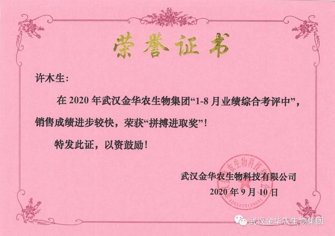 祝賀山東許木生經(jīng)理,他在2020年武漢金華農(nóng)生物集團(tuán)“1-8月業(yè)績綜合考評(píng)中”銷售成績進(jìn)步較快,他拼搏進(jìn)取,踴躍報(bào)貨,榮獲武漢金華農(nóng)老人團(tuán)隊(duì)“拼搏進(jìn)取獎(jiǎng)”,他是一位優(yōu)秀的“老武漢金華農(nóng)人”,為他鼓掌!為他點(diǎn)贊!