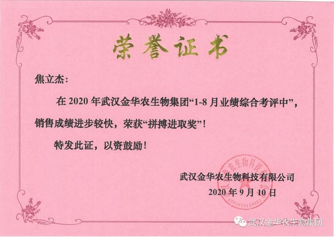 祝賀河北焦立杰經(jīng)理,他在2020年武漢金華農(nóng)生物集團(tuán)“1-8月業(yè)績綜合考評(píng)中”銷售成績進(jìn)步較快,他拼搏進(jìn)取,踴躍報(bào)貨,榮獲武漢金華農(nóng)老人團(tuán)隊(duì)“拼搏進(jìn)取獎(jiǎng)”,他是一位優(yōu)秀的“老武漢金華農(nóng)人P,為他鼓掌!為他點(diǎn)贊!