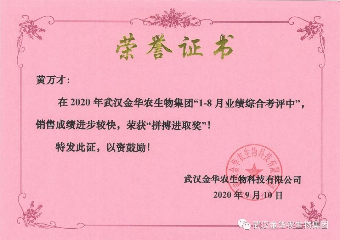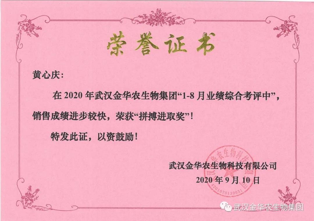 祝賀海南黃心慶經(jīng)理,他在2020年武漢金華農(nóng)生物集團(tuán)“1-8月業(yè)績綜合考評(píng)中”銷售成績進(jìn)步較快,他拼搏進(jìn)取,踴躍報(bào)貨,榮獲武漢金華農(nóng)老人團(tuán)隊(duì)“拼搏進(jìn)取獎(jiǎng)”,他是一位優(yōu)秀的“老武漢金華農(nóng)人”,為他鼓掌!為他點(diǎn)贊!