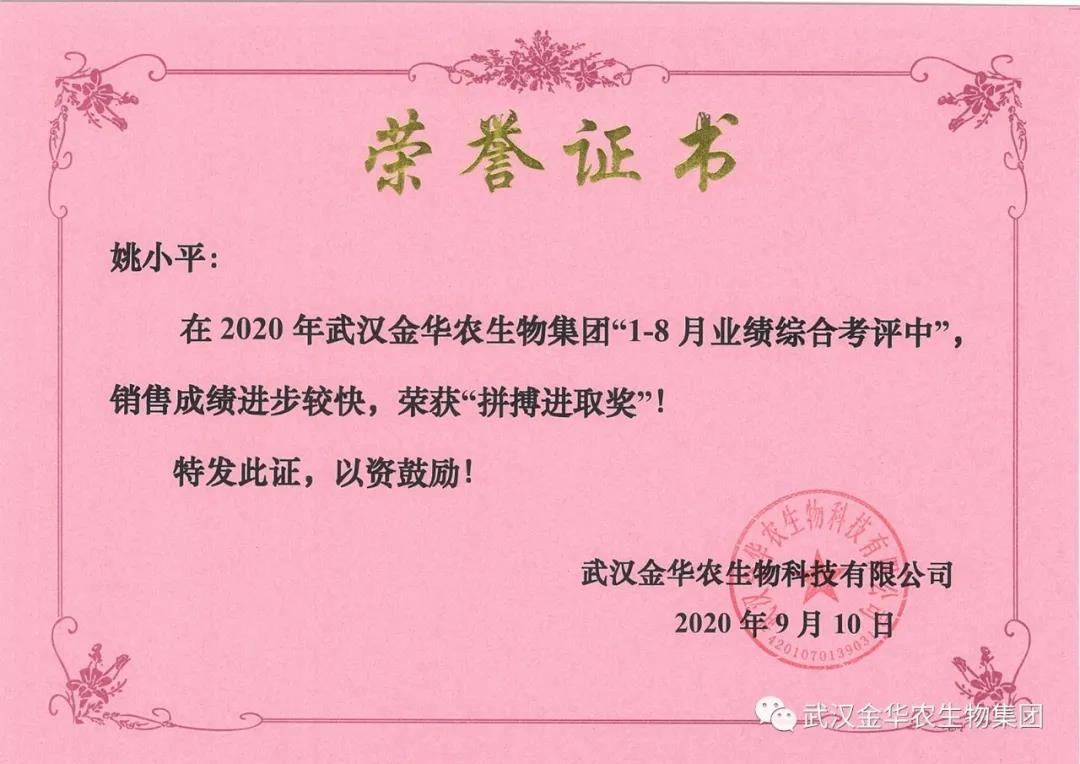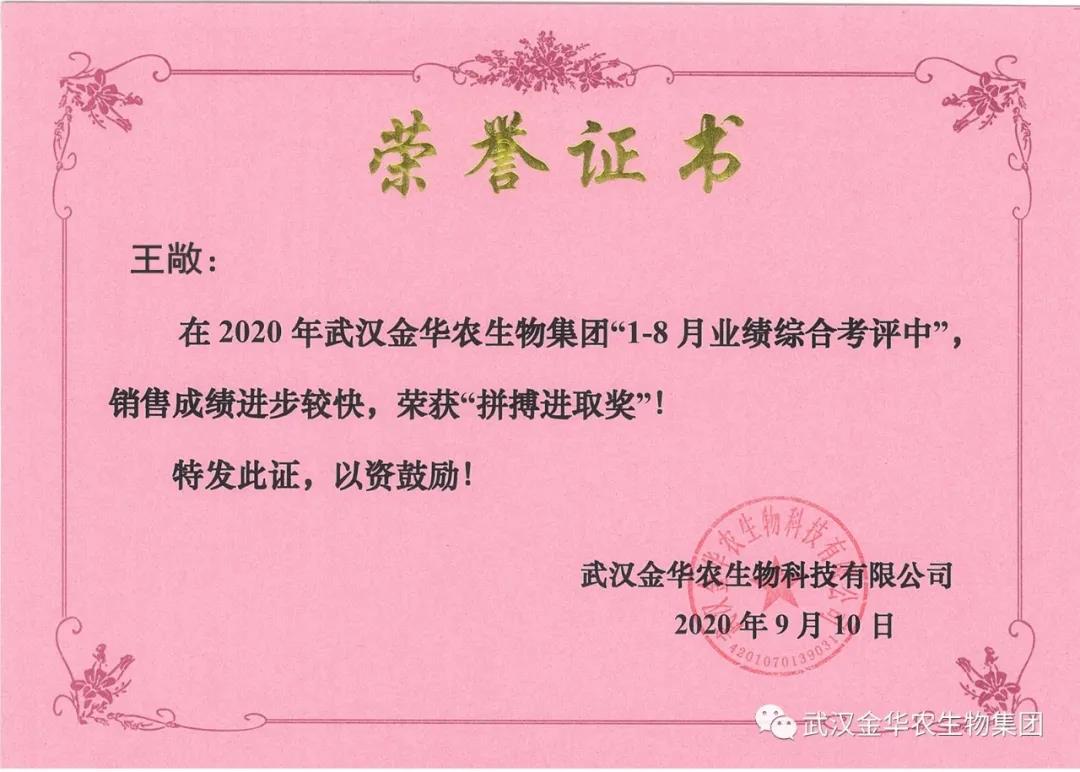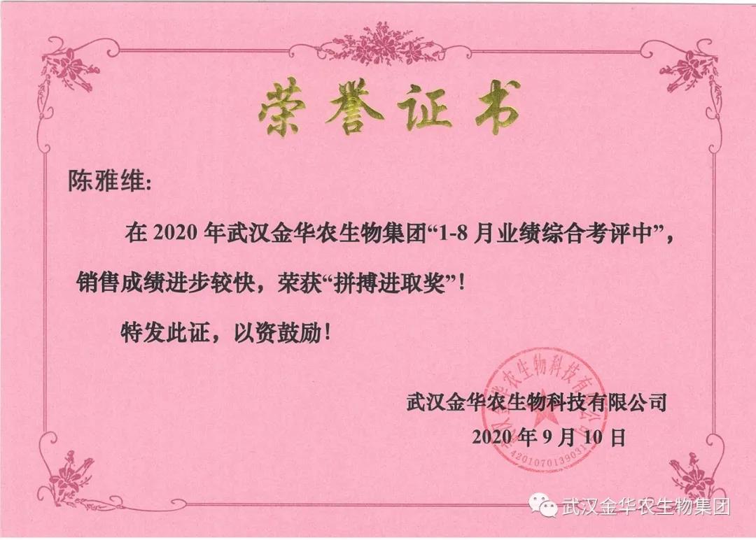 祝賀遼寧陳雅維經(jīng)理,他在2020年武漢金華農(nóng)生物集團(tuán)“1-8月業(yè)績綜合考評(píng)中”銷售成績進(jìn)步較快,他拼搏進(jìn)取,踴躍報(bào)貨,榮獲武漢金華農(nóng)新人團(tuán)隊(duì)“拼搏進(jìn)取獎(jiǎng)”,他是一位優(yōu)秀的“新晉武漢金華農(nóng)人”,為他鼓掌!為他點(diǎn)贊!