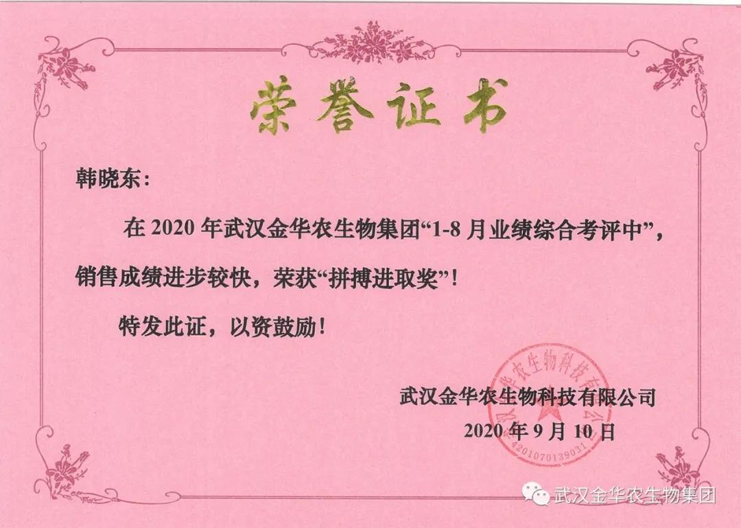 祝賀安徽韓曉東經(jīng)理,他在2020年武漢金華農(nóng)生物集團(tuán)“1-8月業(yè)績綜合考評(píng)中”銷售成績進(jìn)步較快,他拼搏進(jìn)取,踴躍/貨,榮獲武漢金華農(nóng)新人團(tuán)隊(duì)“拼搏進(jìn)取獎(jiǎng)”,他是一位優(yōu)秀的“新晉武漢金華農(nóng)人”,為他鼓掌!為他點(diǎn)贊!