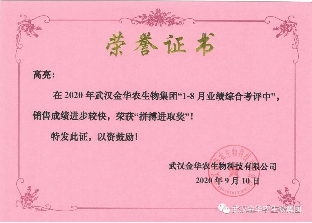 祝賀河南高亮經(jīng)理,他在2020年武漢金華農(nóng)生物集團(tuán)“1-8月業(yè)績N合考評(píng)中”銷售成績進(jìn)步較快,他拼搏進(jìn)取,踴躍報(bào)貨,榮獲武漢金華農(nóng)新人團(tuán)隊(duì)“拼搏進(jìn)取獎(jiǎng)”,他是一位優(yōu)秀的“新晉武漢金華農(nóng)人”,為他鼓掌!為他點(diǎn)贊!