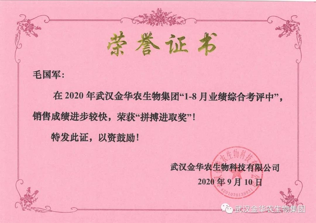 祝賀四川毛國軍經(jīng)理,他在2020年武漢金華農(nóng)生物集團(tuán)“1-8月業(yè)績綜合考評(píng)中”銷售成績進(jìn)步較快,他拼搏進(jìn)取,踴躍報(bào)貨,榮獲武漢金華農(nóng)新人團(tuán)隊(duì)“拼搏進(jìn)取獎(jiǎng)”,他是一位優(yōu)秀的“新晉武漢金華農(nóng)人”,為他鼓掌!為他點(diǎn)贊!