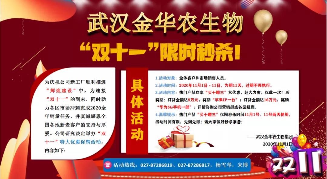 ? ? ?為慶祝公司新工廠順利推進(jìn)“輝煌建設(shè)”中,為真誠(chéng)感恩在這段不平凡歲月中奮戰(zhàn)在動(dòng)保銷售一線的武漢金華農(nóng)同仁,為迎接“雙十一”的到來,同時(shí)助力各區(qū)市場(chǎng)沖刺完成2020全年銷量任務(wù)。弘揚(yáng)“公司發(fā)展我成長(zhǎng),我為公司添光彩”,“人人爭(zhēng)當(dāng)冠軍,人人爭(zhēng)當(dāng)標(biāo)兵”的企業(yè)文化精神,并真誠(chéng)感恩全國(guó)各地新老客戶的支持與厚愛。公司研究決定舉辦“雙十一”特大優(yōu)惠促銷活動(dòng)!年僅一次,超大力度!活動(dòng)內(nèi)容如下:? ? ?