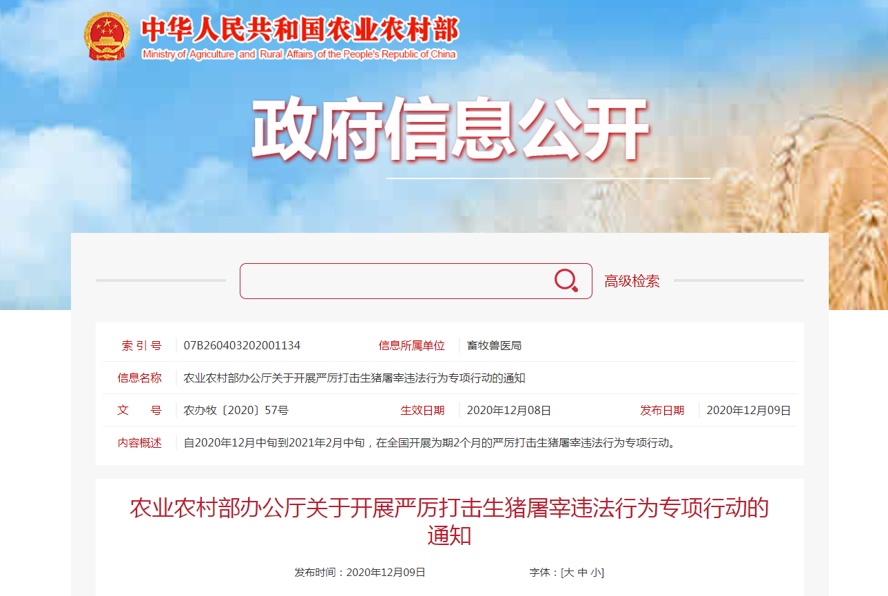 今年以來,各地通過開展農(nóng)產(chǎn)品質(zhì)量安全專項整治“利劍”行動,查辦了一批屠宰環(huán)節(jié)違法案件、搗毀了一批私屠濫宰窩點、銷毀了一批問題產(chǎn)品,有力支持了全國非洲豬瘟防控和生豬生產(chǎn)恢復,有效保障了生豬產(chǎn)品質(zhì)量安全。隨著冬季,特別是元旦春節(jié)消費旺季的到來,豬肉產(chǎn)品消費將進入高峰期,從近期各地案件查辦情況看,私屠濫宰等屠宰環(huán)節(jié)違法案件呈上升趨勢。為切實維護生豬屠宰行業(yè)秩序,保證生豬產(chǎn)品質(zhì)量安全,保障節(jié)日期間豬肉消費安全和人民身體健康,農(nóng)業(yè)農(nóng)村部決定自2020年12月中旬到2021年2月中旬,在全國開展為期2個月的嚴厲打擊生豬屠宰違法行為專項行動?,F(xiàn)就有關(guān)事項通知如下。
