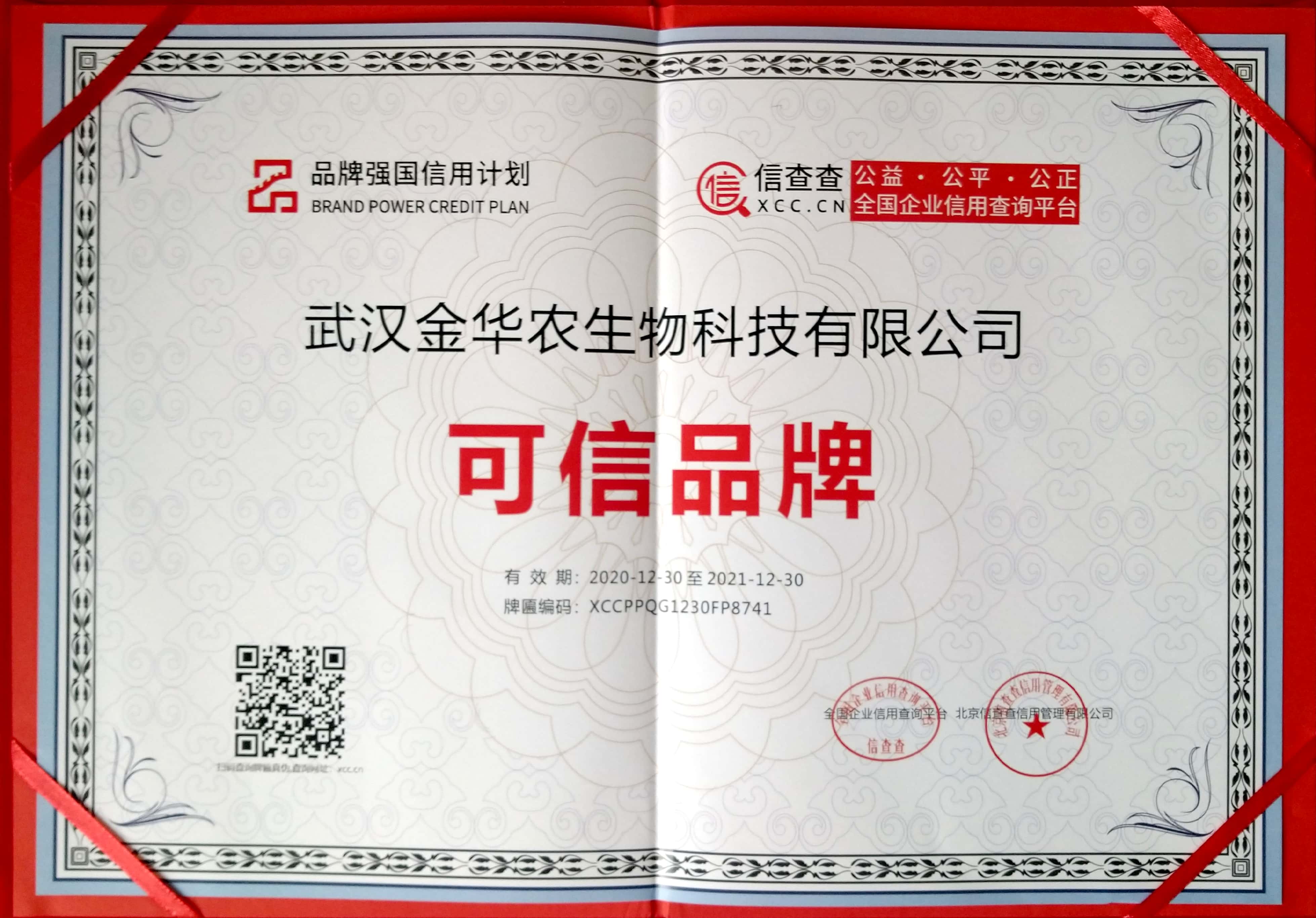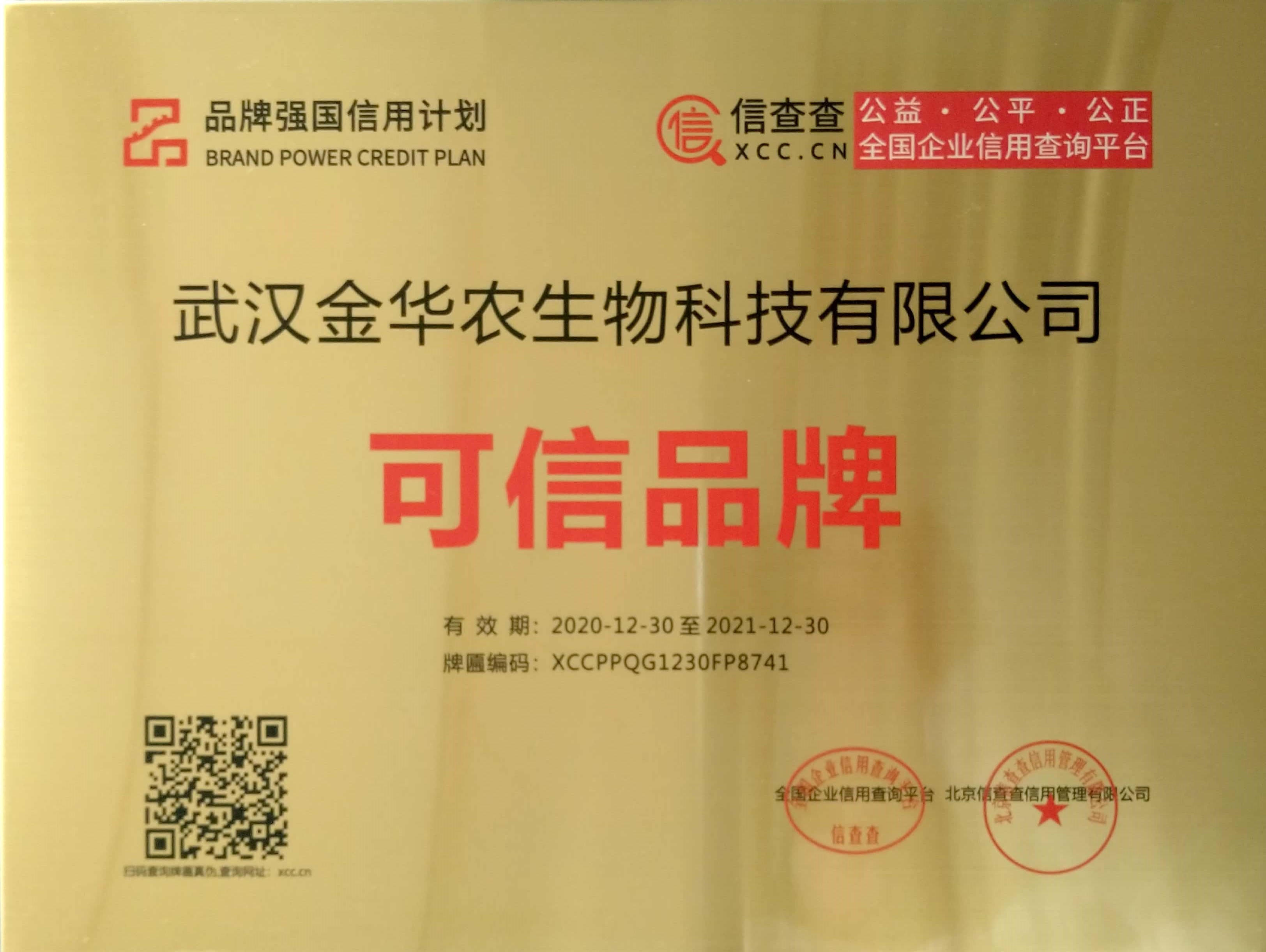 2021年1月11日,新年伊始,萬象更新,奮發(fā)圖強,再接再勵!武漢金華農(nóng)生物也迎來新年諸多利好消息,新年第一個月“元月份”業(yè)績突飛猛進(jìn),銷量翻番;公司新研發(fā)的新產(chǎn)品配方陸續(xù)完成基礎(chǔ)工作,國家申報工作也進(jìn)一步推進(jìn);公司憑借長期以來誠信為本、誠信經(jīng)營、重合同守信譽,產(chǎn)品質(zhì)量第一,技術(shù)服務(wù)第一的經(jīng)營理念,在社會發(fā)展、助農(nóng)扶貧、抗擊疫情等領(lǐng)域的持續(xù)投入和杰出表現(xiàn),同時保證經(jīng)營狀態(tài)正常良好,無失信紀(jì)錄、無違法、無負(fù)面輿情等條件,被國家信用平臺、品牌強國計劃評選為“可信品牌”,并被授予“中國可信品牌企業(yè)”榮譽稱號,在北京隆重舉行視頻授予儀式,新年之初,獲得新的榮譽,開啟新發(fā)展!