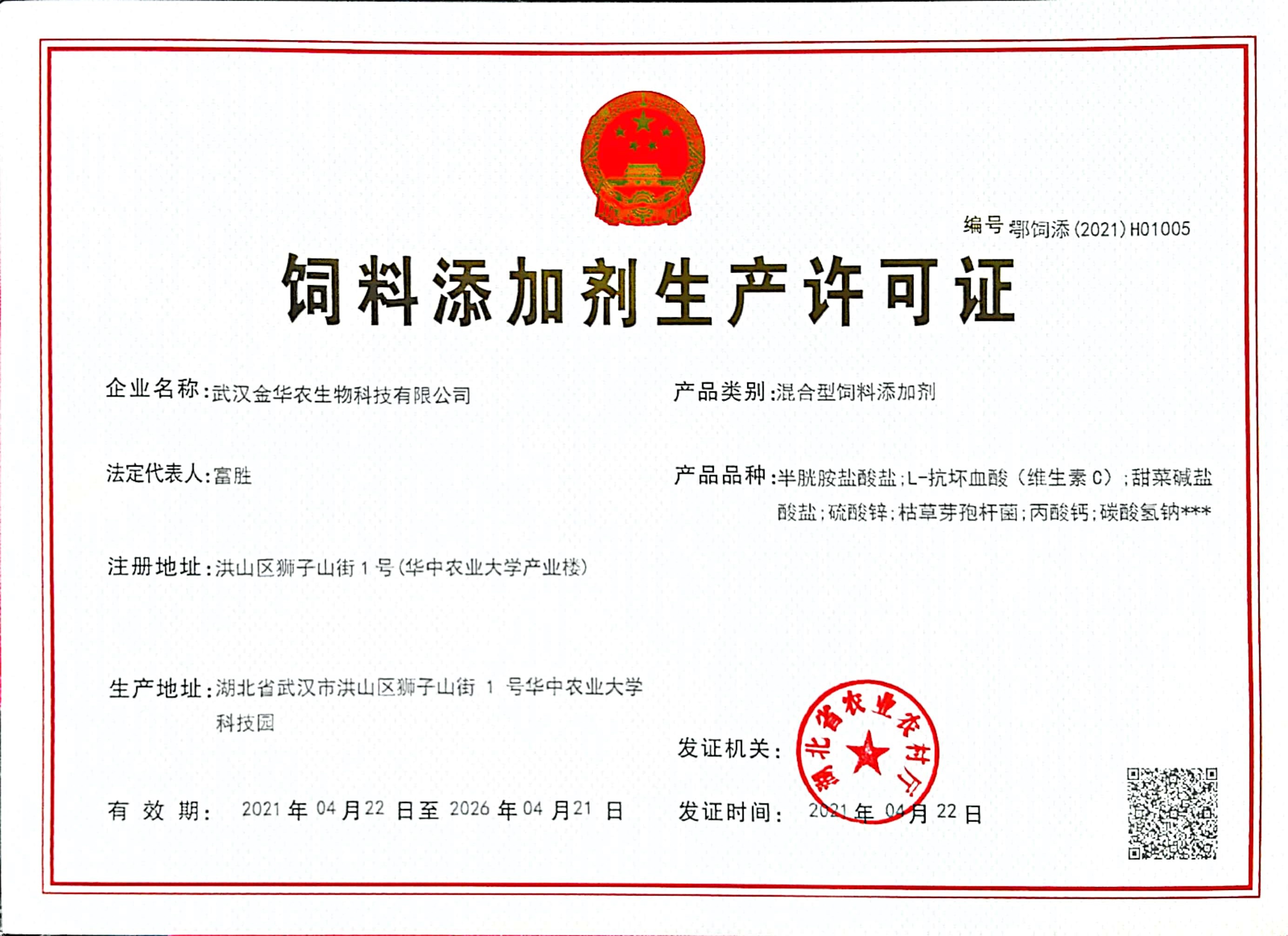 ?武漢金華農(nóng)榮獲“飼添生產(chǎn)”許可新證