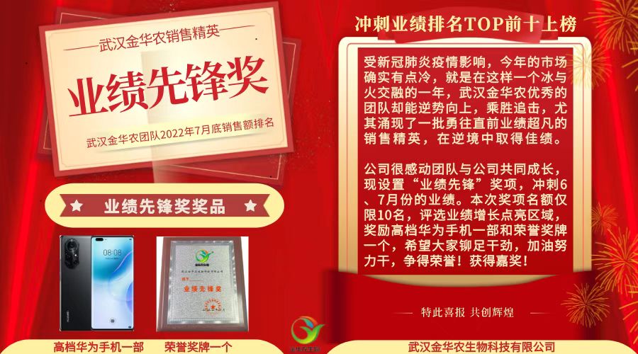 ? ? 公司很感動精英團隊與公司共同成長,現(xiàn)設置“業(yè)績先鋒”獎項,沖刺6、7月份的業(yè)績本次獎項名額僅限10名,評選業(yè)績增長點亮區(qū)域。經(jīng)公司研究決定,特舉辦以下評選“業(yè)績先鋒獎”活動,業(yè)績先鋒獎10名。評選標準為6-7月份銷售額前十名,榮譽獎品:高檔華為手機一部 、榮譽獎牌一個。