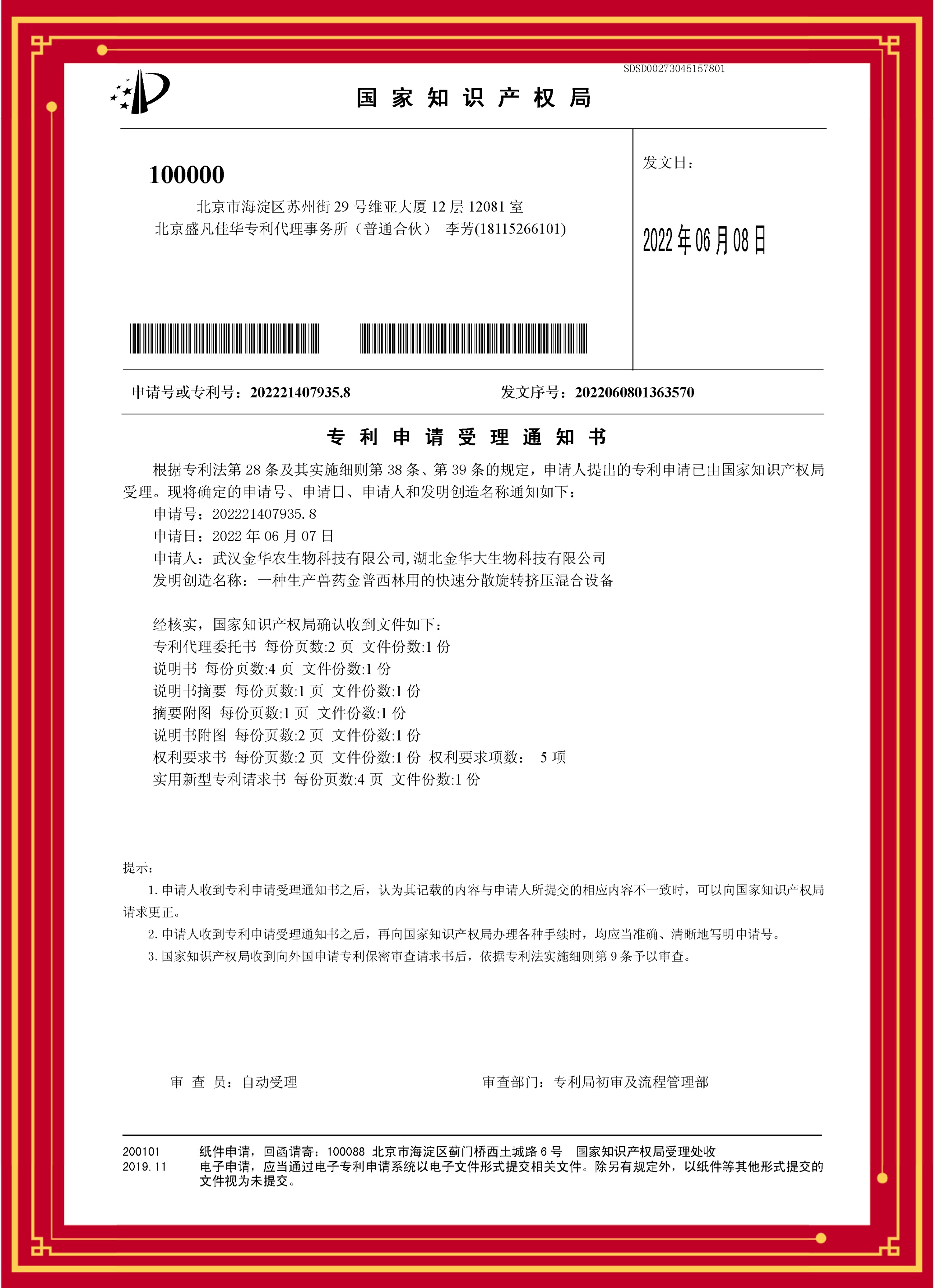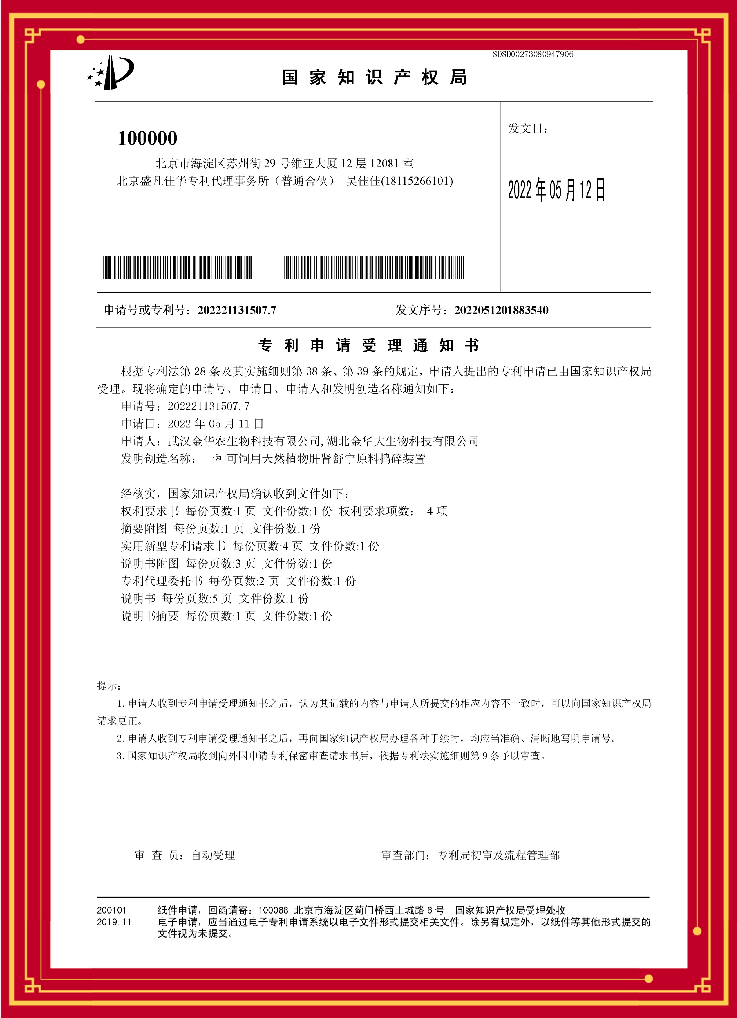 ? ? 繼“優(yōu)樂肽、快速壯、氟泰肺寧、藍圓瘟毒克、高熱病毒靈、金替呼諾”產(chǎn)品榮獲專利證書后,近日,武漢金華農(nóng)又一批拳頭產(chǎn)品獲得專利證書。產(chǎn)品“伊苯佳、黃金多維C、肝腎舒寧、弓球痢康、金普西林”5項目科技發(fā)明獲得國家榮譽專利,《一種家禽養(yǎng)殖用殺蟲劑伊苯佳配制長效裝置》,專利號:202221076567.3;《一種用于飼料添加劑黃金多維C的輔料原料粉碎增效機構(gòu)》,專利號:202221071292.4;《一種可飼用天然植物龍膽護肝素肝腎舒寧原料搗碎裝置》,專利號:202221131507.7;《一種獸藥生產(chǎn)用弓球痢康粉劑包裝機》,專利號:202221108553.5;《一種生產(chǎn)獸藥金普西林用的快速分散旋轉(zhuǎn)擠壓混合設備》,專利號:202221407935.8,獲得國家知識產(chǎn)權(quán)局授權(quán),并獲得專利受理證書。
