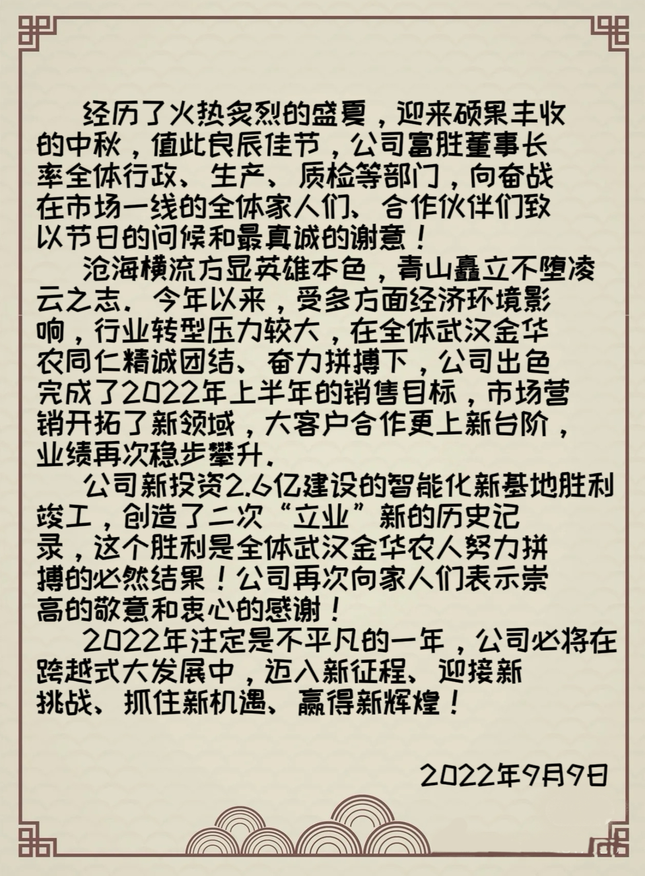 “吃在嘴里,甜在心里。”公司為每位員工送上節(jié)日的問候與祝福,溫暖了大家的眼角眉梢,也牽起了大家的嘴角。在武漢金華農(nóng)大家庭,匯聚了四面八方的歡聲笑語,齊聚了五湖四海的秋思鄉(xiāng)情。