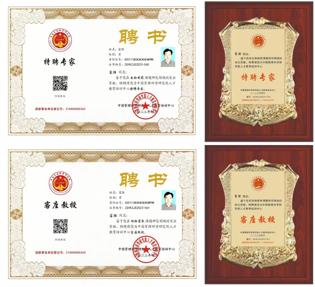 鑒于武漢金華農(nóng)生物科技有限公司在“動(dòng)保生物制藥”與“動(dòng)物營(yíng)養(yǎng)”領(lǐng)域的影響力和杰出貢獻(xiàn),經(jīng)研究決定,特授予富勝董事長(zhǎng)『中國(guó)管理科學(xué)研究院特聘專(zhuān)家』、『中國(guó)管理科學(xué)研究院客座教授』兩項(xiàng)榮譽(yù)。