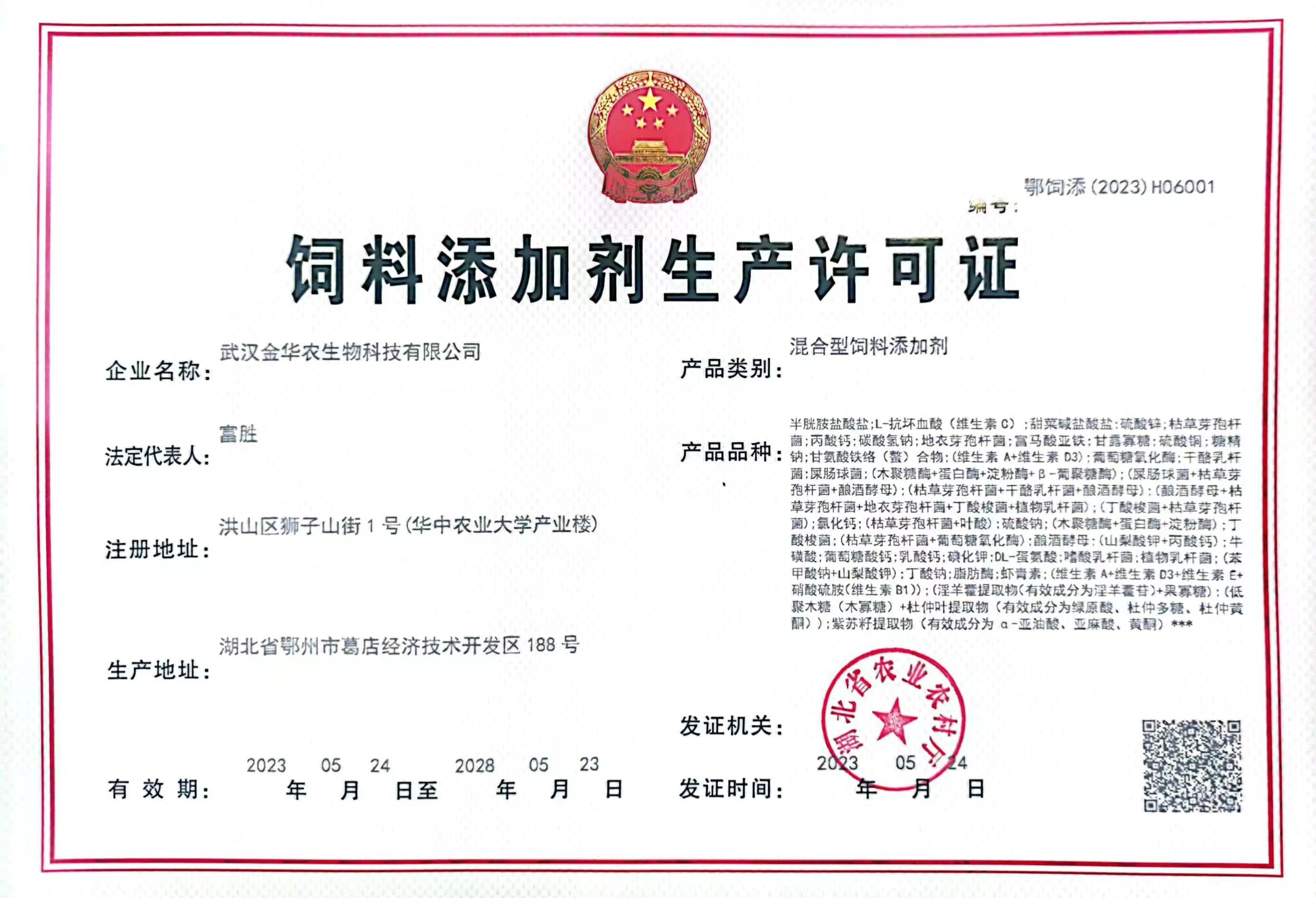 2023年5月24日,武漢金華農(nóng)生物科技有限公司(下文簡(jiǎn)稱“武漢金華農(nóng)”)混合型飼料添加劑新生產(chǎn)線正式獲得湖北省農(nóng)業(yè)農(nóng)村廳頒發(fā)的“鄂飼添(2023)H06001生產(chǎn)許可證”和新的飼料添加劑45個(gè)新品種,這將進(jìn)一步完善公司產(chǎn)品的功能性覆蓋、進(jìn)一步擴(kuò)大市場(chǎng)占有率、進(jìn)一步促進(jìn)武漢金華農(nóng)的產(chǎn)業(yè)升級(jí)擴(kuò)容。