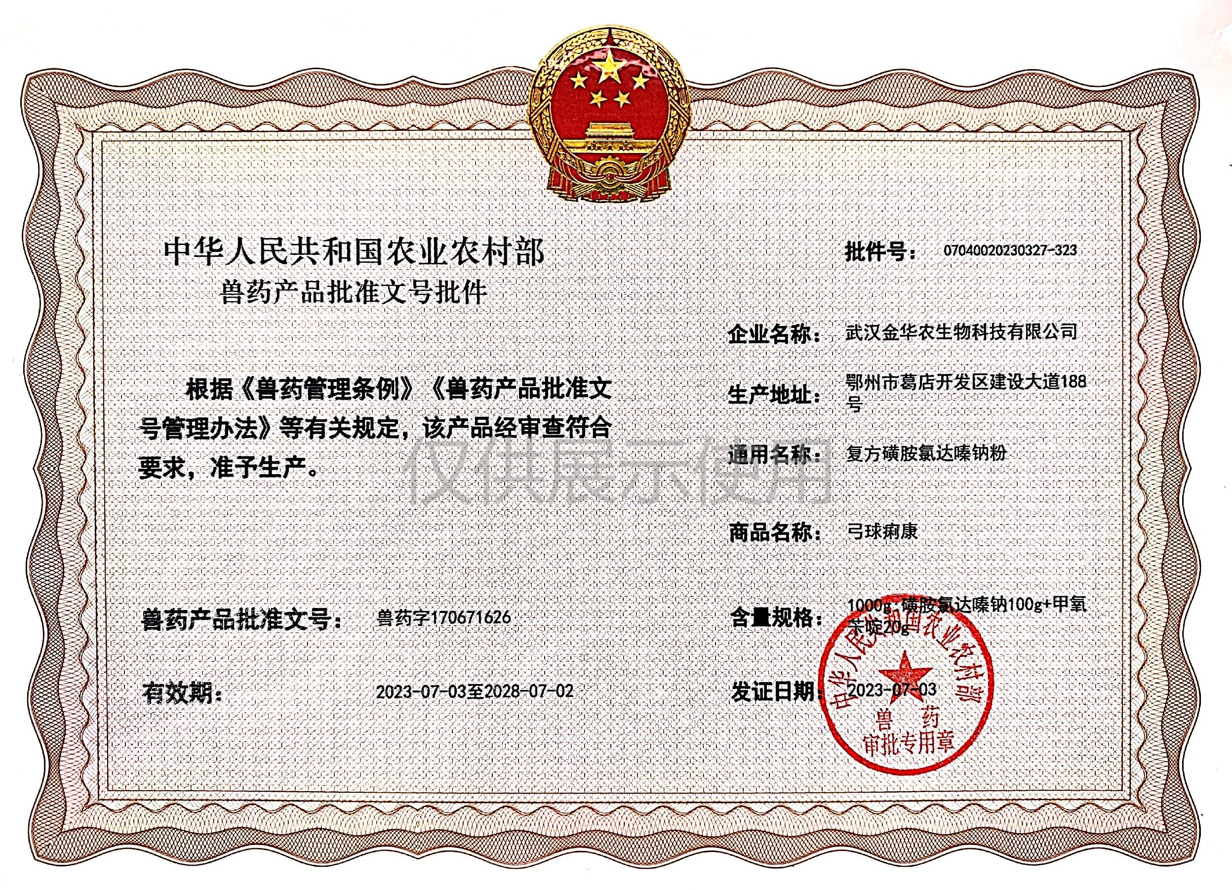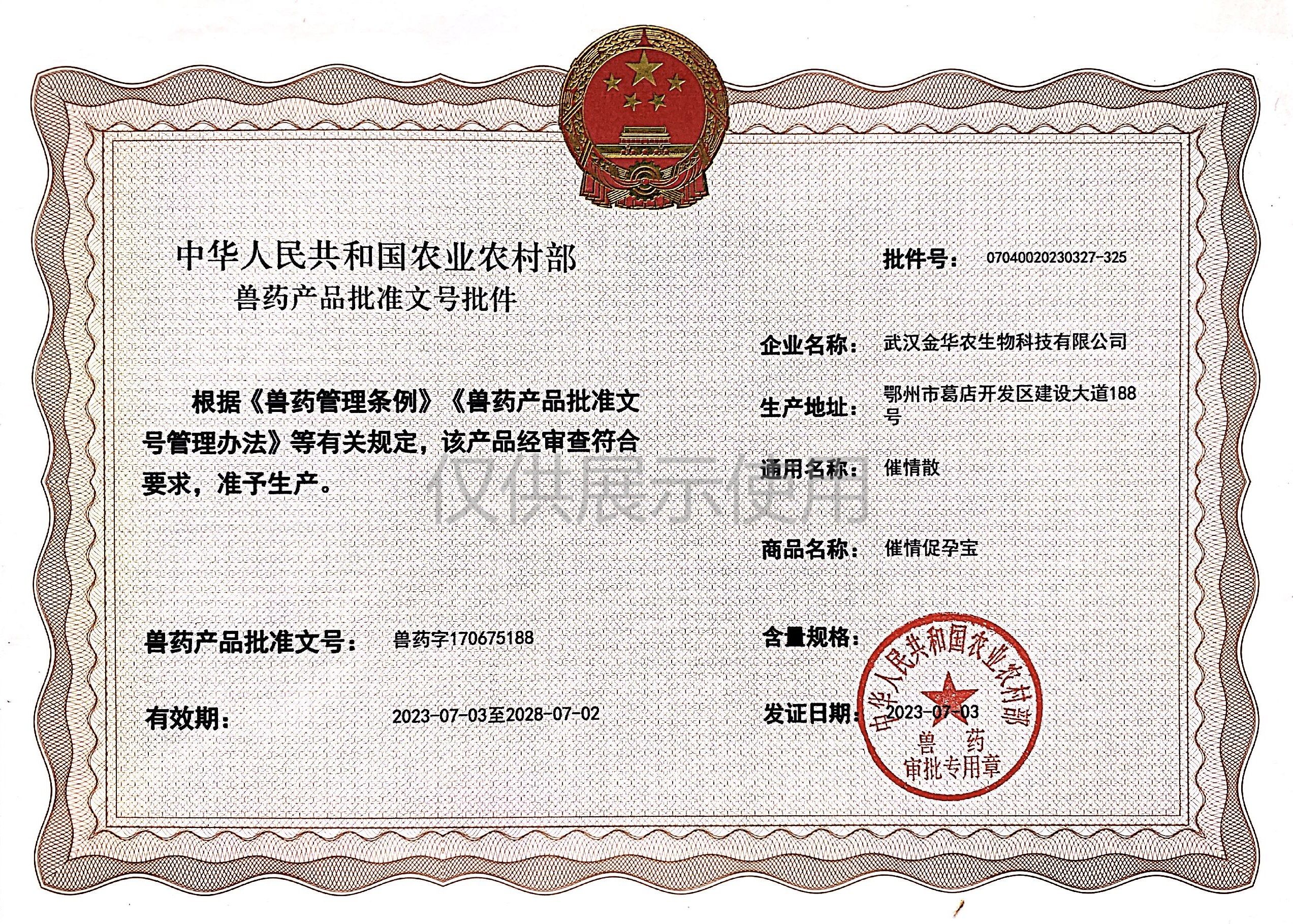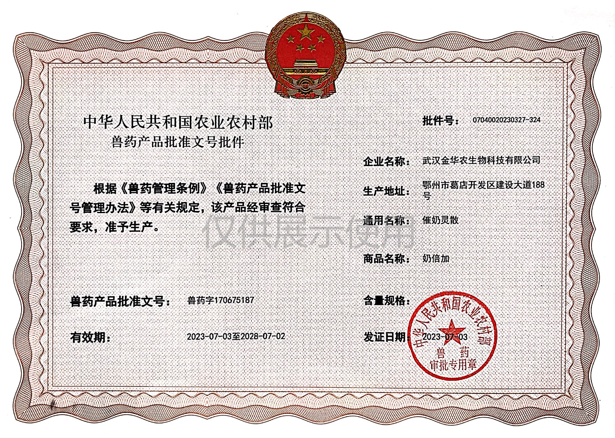 根據(jù)《獸藥管理?xiàng)l例》和《獸藥產(chǎn)品批準(zhǔn)文號管理辦法》的規(guī)定,經(jīng)農(nóng)業(yè)農(nóng)村部審查,準(zhǔn)予核發(fā)武漢金華農(nóng)生物科技有限公司(以下簡稱“武漢金華農(nóng)生物”)國家新版GMP9種獸藥相關(guān)產(chǎn)品批準(zhǔn)文號,這是今年獲取的第三批獸藥產(chǎn)品批準(zhǔn)文號,截至目前,我司已獲得農(nóng)業(yè)農(nóng)村部頒發(fā)的新版GMP獸藥文號20個。