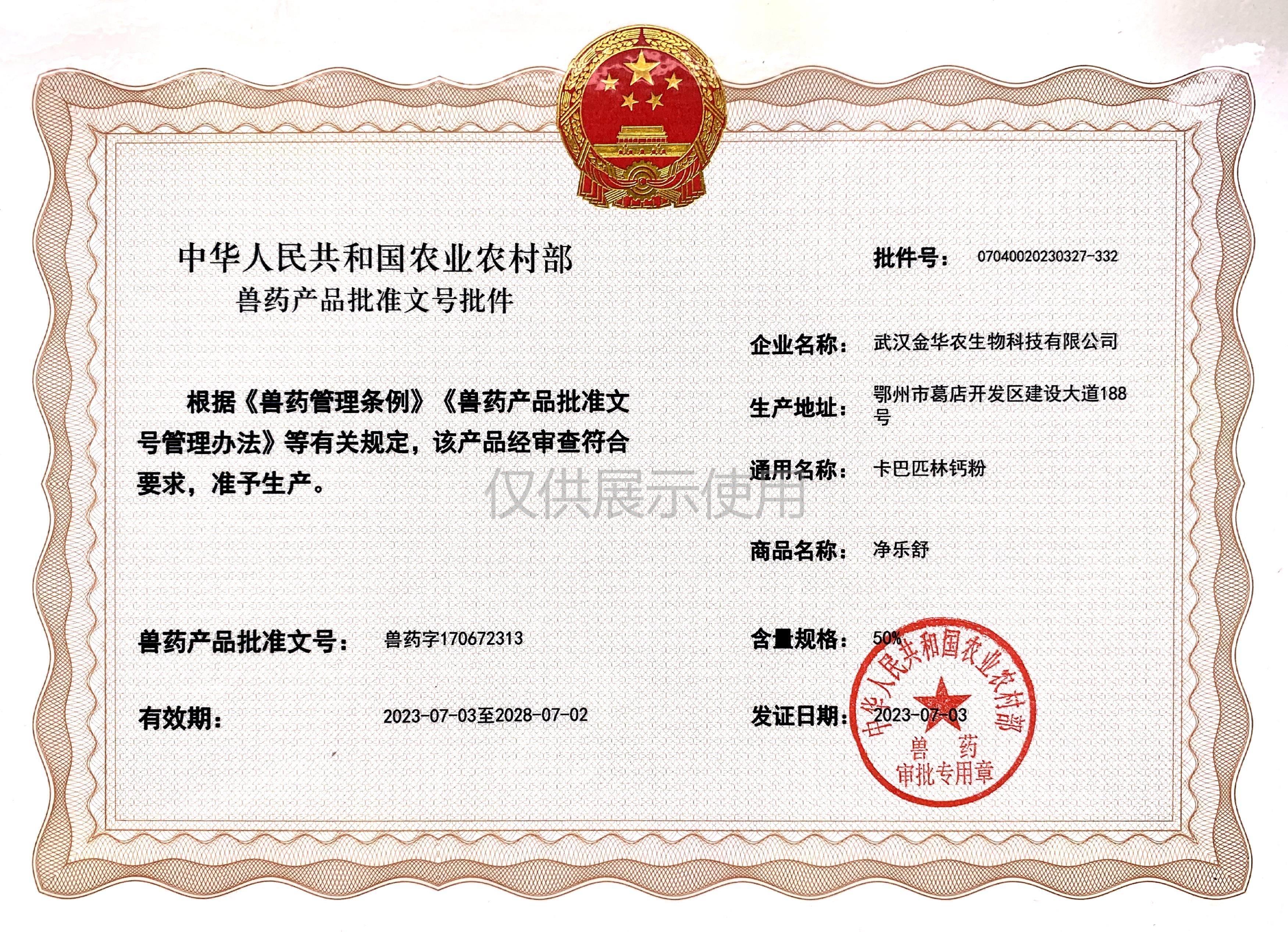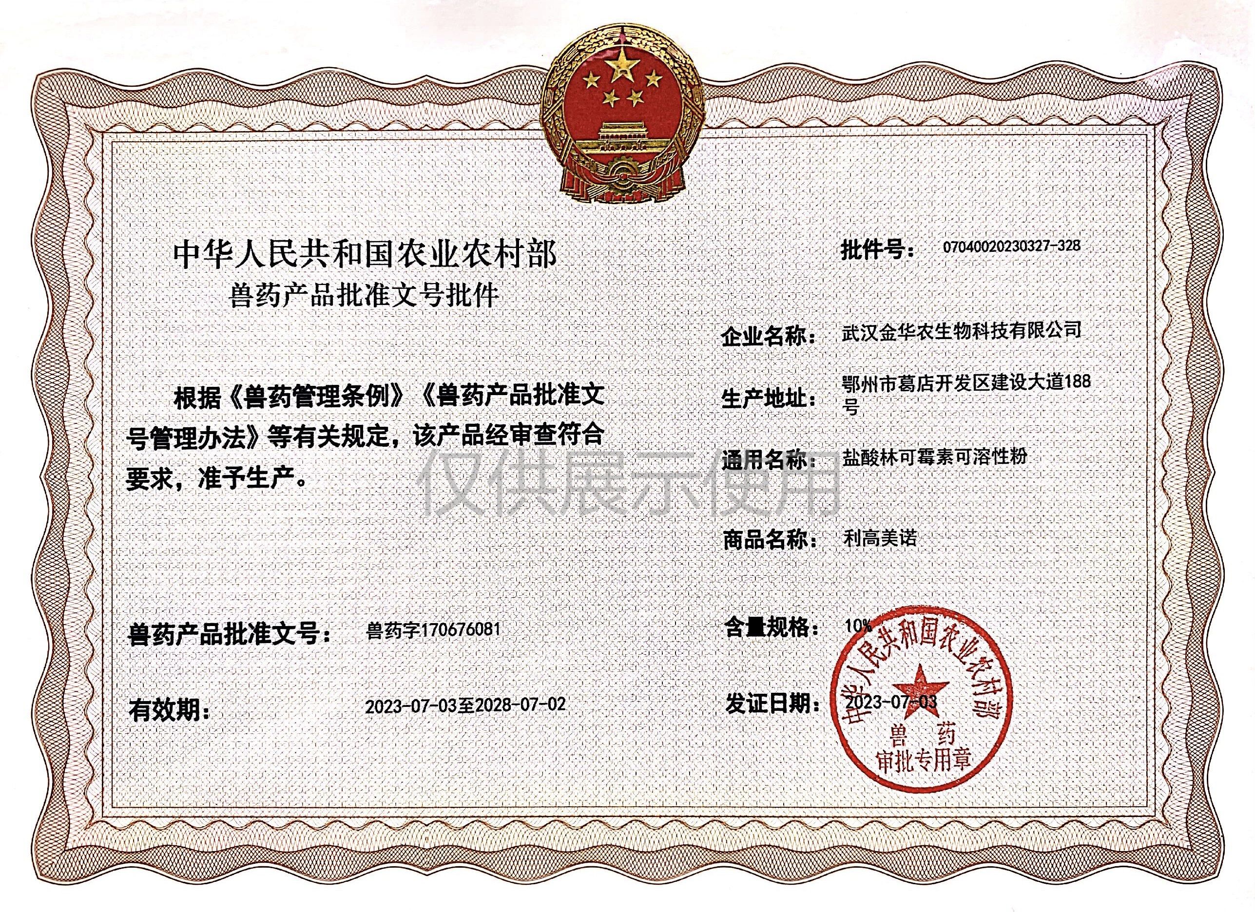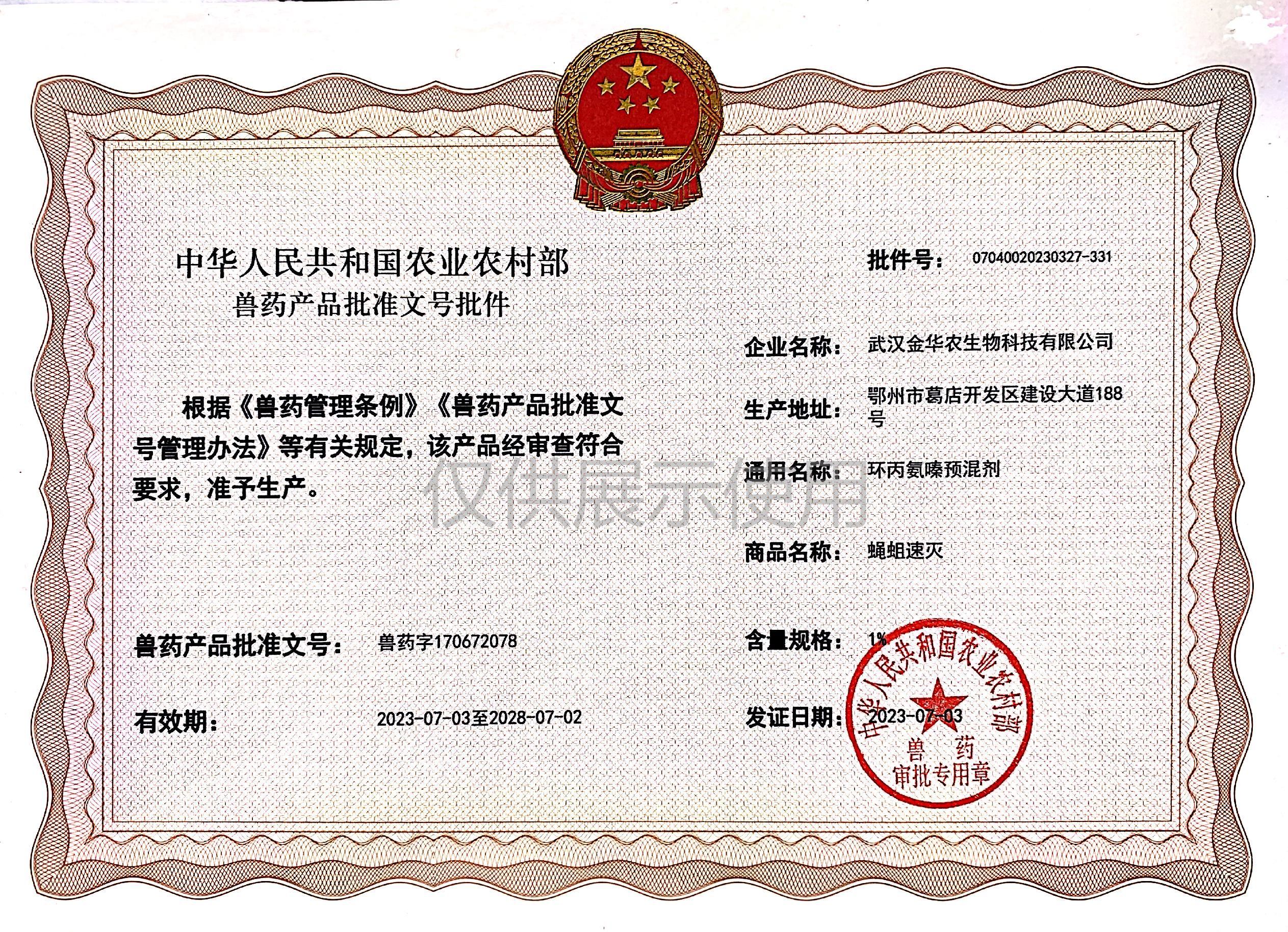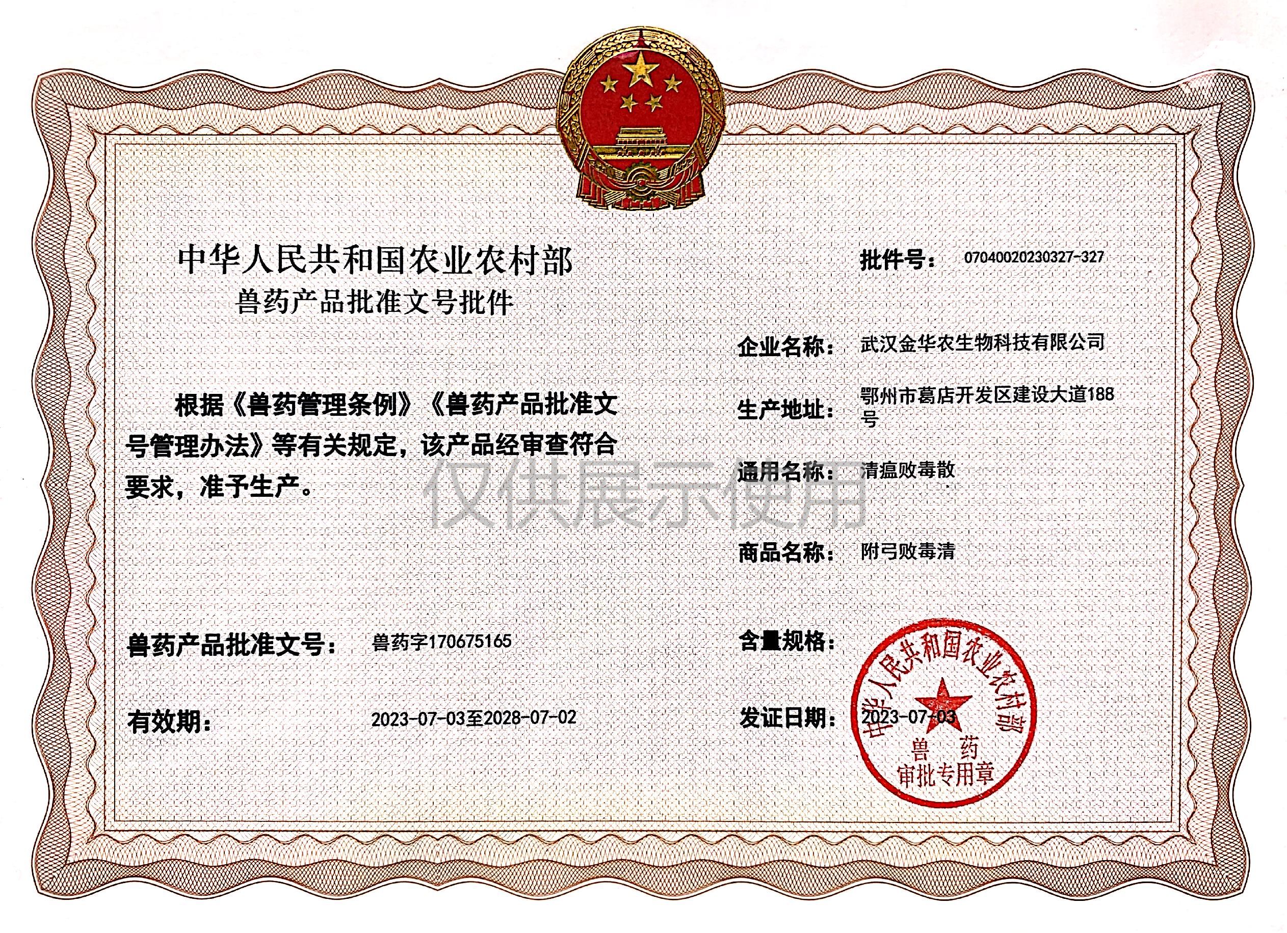 根據(jù)《獸藥管理?xiàng)l例》和《獸藥產(chǎn)品批準(zhǔn)文號管理辦法》的規(guī)定,經(jīng)農(nóng)業(yè)農(nóng)村部審查,準(zhǔn)予核發(fā)武漢金華農(nóng)生物科技有限公司(以下簡稱“武漢金華農(nóng)生物”)國家新版GMP9種獸藥相關(guān)產(chǎn)品批準(zhǔn)文號,這是今年獲取的第三批獸藥產(chǎn)品批準(zhǔn)文號,截至目前,我司已獲得農(nóng)業(yè)農(nóng)村部頒發(fā)的新版GMP獸藥文號20個。