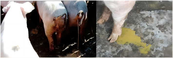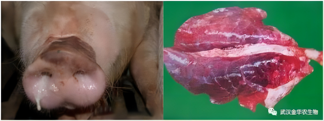 ②豬出現(xiàn)鐵銹斑、淚斑、糞便結(jié)塊等高熱導(dǎo)致的一系列病癥,用“附弓敗毒清+華農(nóng)樂健”。