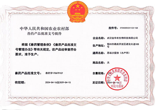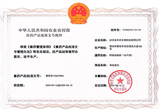 根據(jù)《獸藥管理條例》和《獸藥產(chǎn)品批準(zhǔn)文號管理辦法》的規(guī)定,經(jīng)農(nóng)業(yè)農(nóng)村部審查,準(zhǔn)予核發(fā)武漢金華農(nóng)生物科技有限公司2個新版GMP水產(chǎn)漁藥相關(guān)產(chǎn)品批準(zhǔn)文號。
