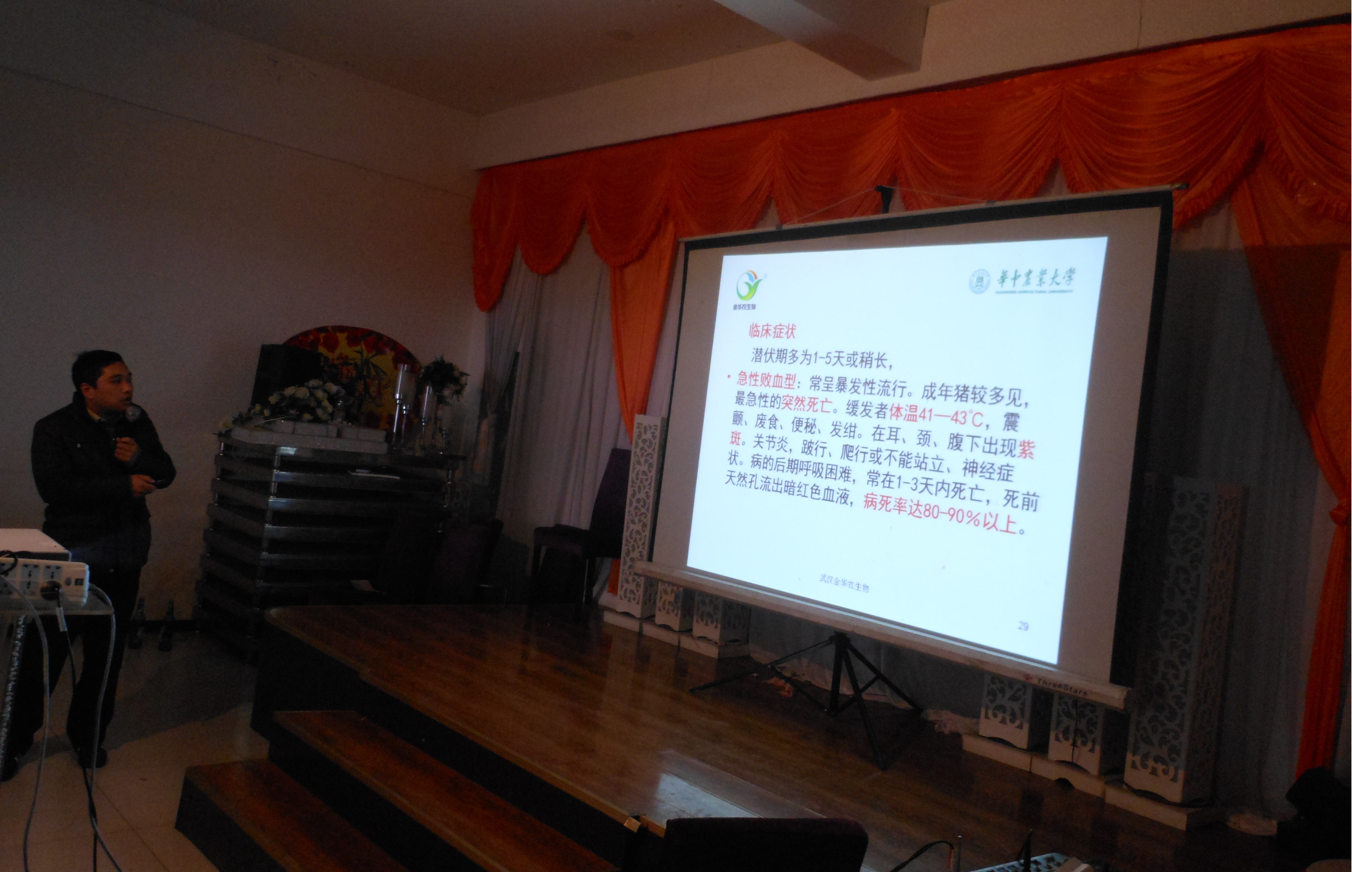 此次會(huì)議主要涉及到豬口蹄疫、喘氣病、傳染性胸膜肺炎、豬傳染性胃腸炎、仔豬黃痢疾、白痢疾等冬季易發(fā)病。胡老師針對(duì)每種疾病的癥狀進(jìn)行詳細(xì)講解,并用淺顯易懂的語言回答現(xiàn)場(chǎng)養(yǎng)殖戶的疑問,有效的互動(dòng)讓整個(gè)會(huì)議氣氛熱烈而輕松。