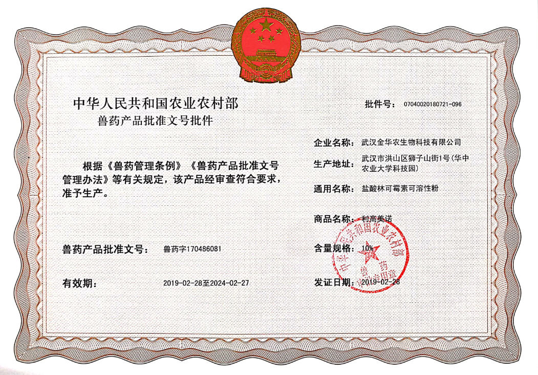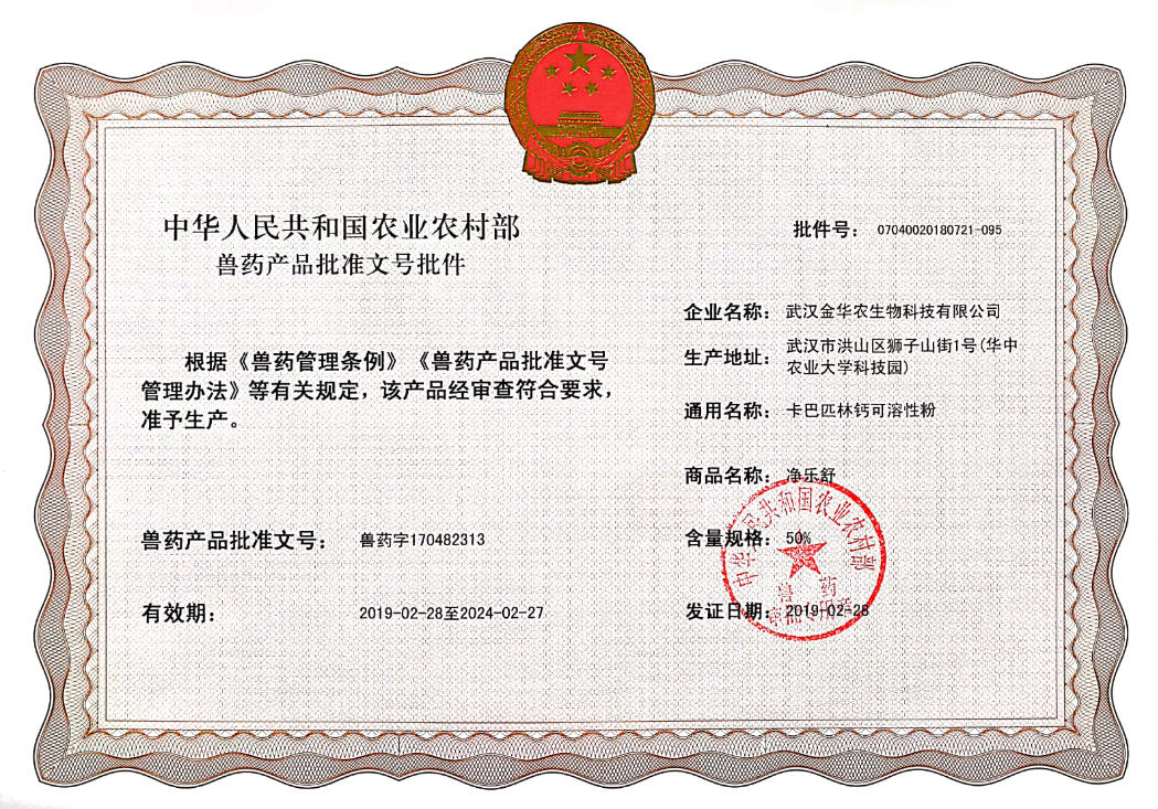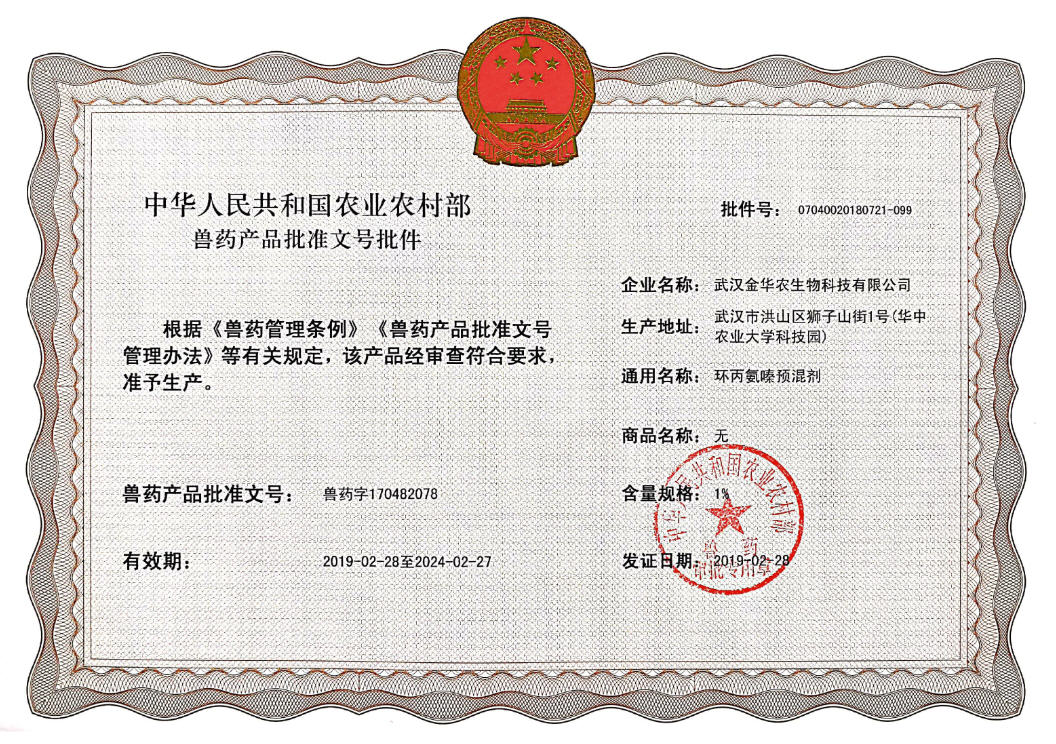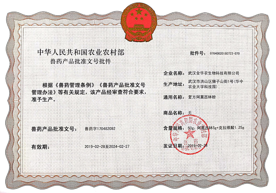 截止2019年3月7日,公司申報國家農(nóng)業(yè)農(nóng)村部的多個獸藥批文批號,“克拉美林500g”(復(fù)方阿莫西林),“凈樂舒500g”(卡巴匹林鈣)、“利高美諾500g”(鹽酸林可霉素),“蠅蛆凈500g”(環(huán)丙氨嗪預(yù)混劑)等4個產(chǎn)品,獲得農(nóng)業(yè)農(nóng)村部高度認可,并正式榮譽頒發(fā)證書、也成為“馳名商標(biāo)+杰出品牌”,值此收獲之際,感謝各位養(yǎng)殖老板們對武漢金華農(nóng)動保產(chǎn)品的長期信任與贊美!好獸藥,武漢金華農(nóng)造!