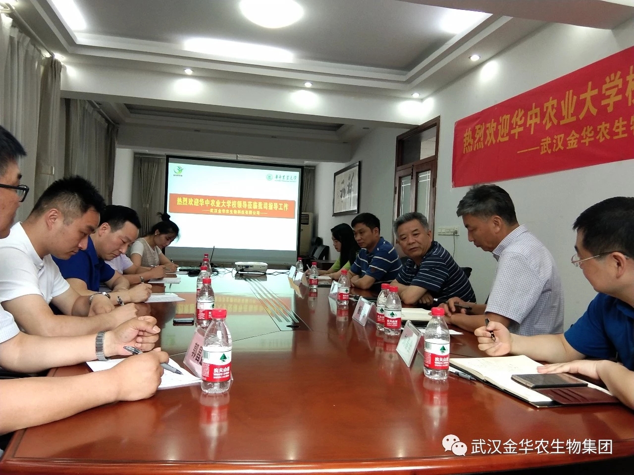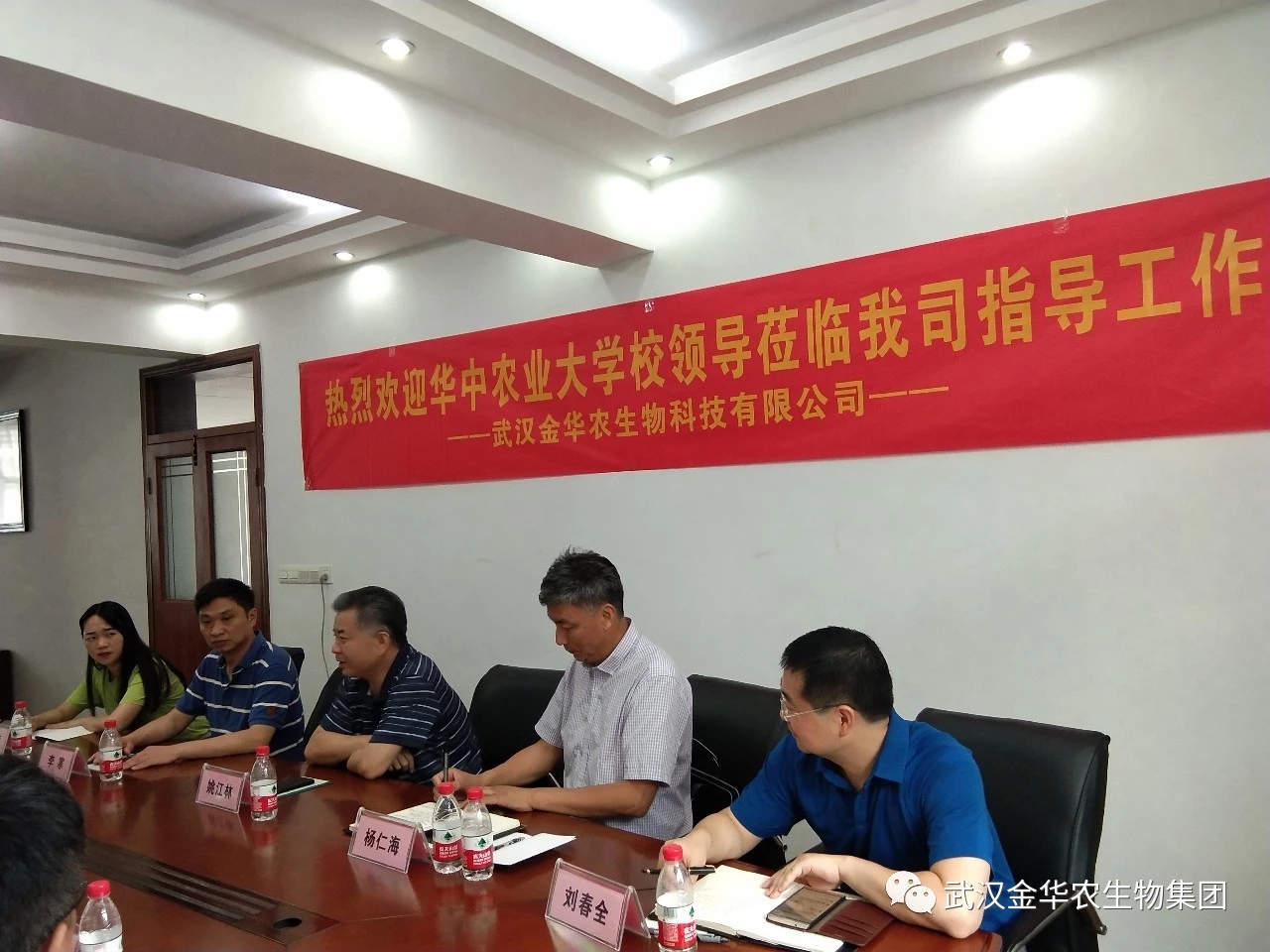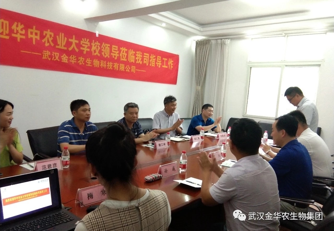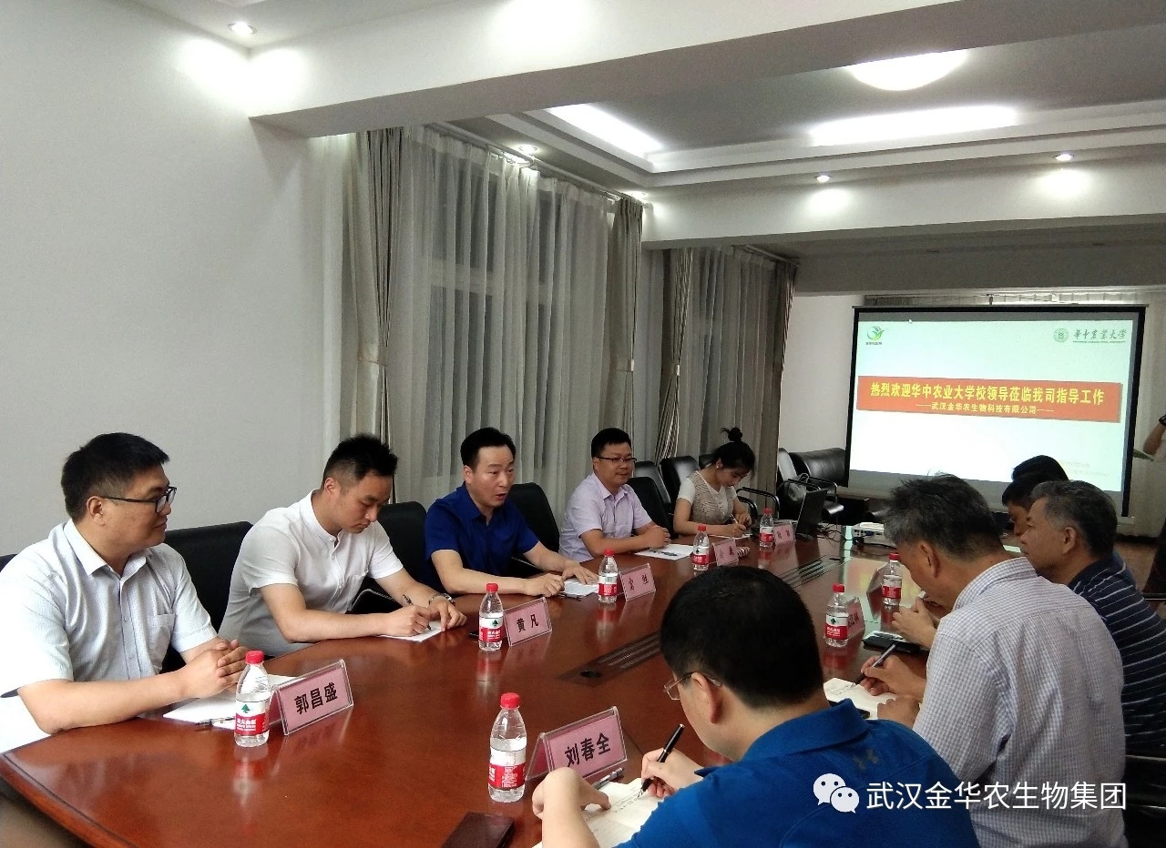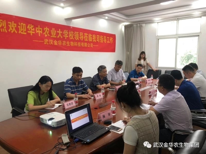 2019年6月12日,華中農(nóng)業(yè)大學黨委副書記、副校長姚江林,華中農(nóng)業(yè)大學資產(chǎn)經(jīng)營與后勤保障部部長李寒,華中農(nóng)業(yè)大學校友與基金工作辦公室主任楊仁海,華中農(nóng)業(yè)大學資產(chǎn)經(jīng)營與后勤保障部副部長劉春全,一行4人蒞臨武漢金華農(nóng)生物科技有限公司,就雙方深入開展校企聯(lián)合等工作進行會談交流。