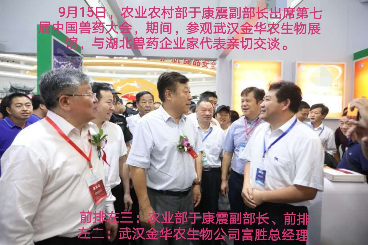 會議期間,于康震副部長參觀并視察了湖北省獸藥企業(yè)展館,親自來到武漢金華農(nóng)生物集團(tuán)展館前了解企業(yè)發(fā)展情況,傾聽民聲民情,為企業(yè)解決疑難問題,關(guān)心湖北省獸藥企業(yè)的發(fā)展情況!仔細(xì)聆聽了以富勝總經(jīng)理為代表的湖北省獸藥企業(yè)家的工作匯報!并點頭微笑,肯定與贊美湖北省獸藥企業(yè)發(fā)展良好,為人民的食品安全作出貢獻(xiàn)!肯定武漢金華農(nóng)生物的發(fā)展迅速,科技創(chuàng)新突破,并鼓勵大干快上,為社會和行業(yè)作出應(yīng)有的貢獻(xiàn),承擔(dān)應(yīng)有的社會責(zé)任!